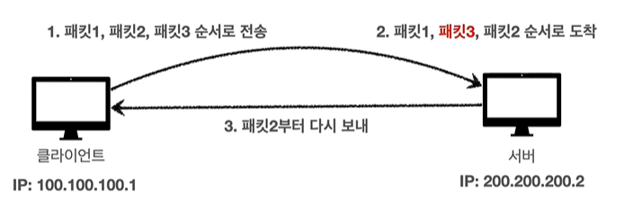 - 패킷이 순서대로 안 올 수 있다.