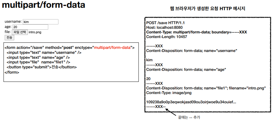 - 다른 종류의 여러 파일과 폼의 내용 함께 전송 가능(그래서 이름이 multipart)