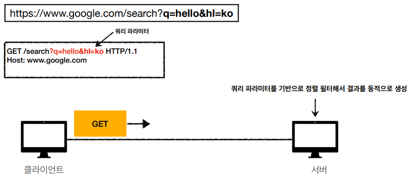 - GET은 쿼리 파라미터 사용해서 데이터를 전달