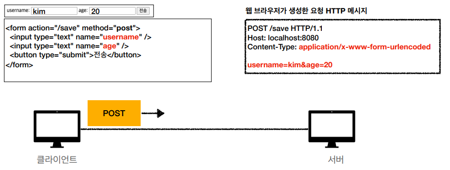 - form의 내용을 메시지 바디를 통해서 전송(key=value, 쿼리 파라미터 형식)