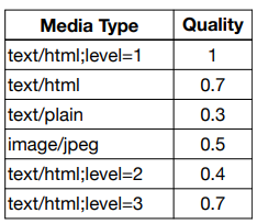 - Accept: text/*;q=0.3, text/html;q=0.7, text/html;level=1, text/html;level=2;q=0.4, */*;q=0.5