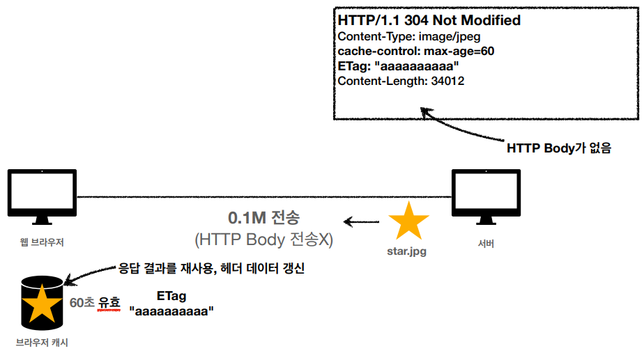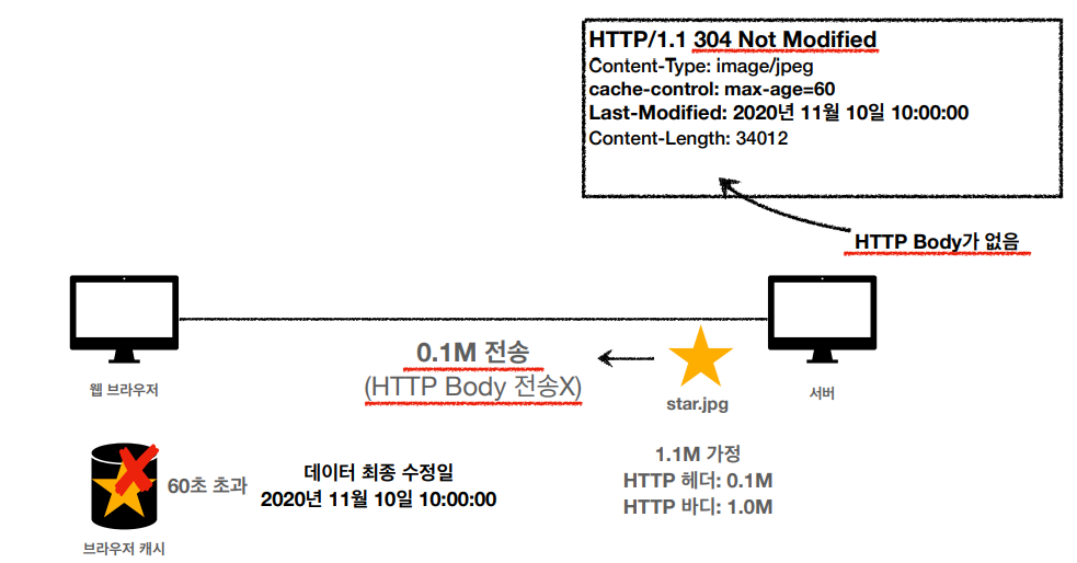 - 서버, 캐시 데이터의 최종 수정일을 비교하여 같다면, HTTP Body를 전송하지 않는다.