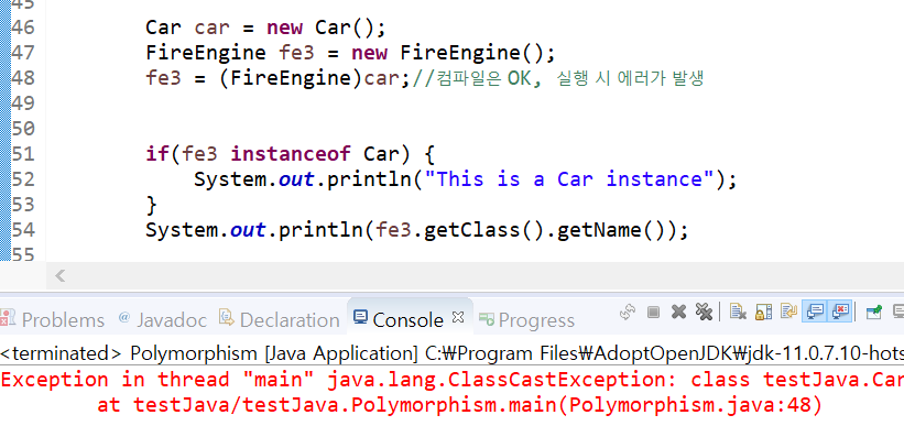캐스트 연산자를 이용해서 조상타입의 참조변수를 자손타입의 참조변수로 형변환한 것이기 때문에 문제가 없어 보이지만, car가 참조하고 있는 인스턴스가 Car타입의 인스턴스라는데 있다. 조상타입의 인스턴스를 자손타입의 참조변수로 참조하는 것은 허용되지 않는다.