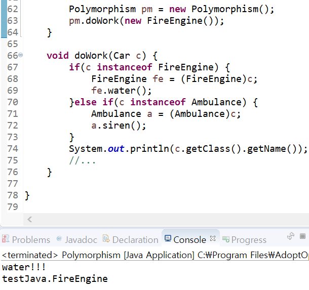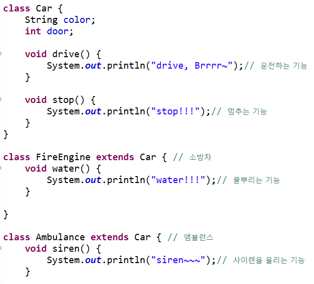 Car클래스는 FireEngine클래스와 Ambulance클래스의 조상이다. 그렇다고 해서 FireEngine클래스와 Ambulance클래스가 형제관계는 아니다. 잡에서는 조상과 자식관계만 존재하기 때문에 FireEngine클래스와 Ambulance클래스는 서로 아무런 관계가 없다.