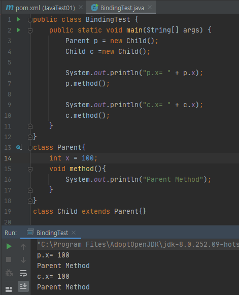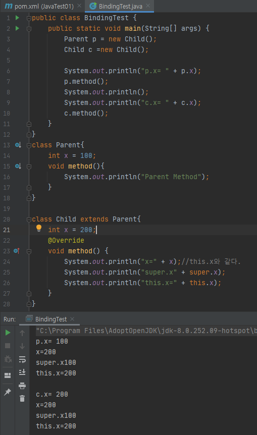 자손 클래스 Child에 선언된 인스턴스변수 x와 조상 클래스 Parent로부터 상속받은 인스턴스변수 x를 구분하는데 참조변수 super와 this가 사용된다. 자손인 Child클래스에서의 super.x는 조상 클래스인 Parent에 선언된 인스턴스변수 x를 뜻하며, this.x 또는 x는 Child클래스의 인스턴스변수 x를 뜻한다. 그래서 위 결과에서 x와 this.x의 값이 같다.