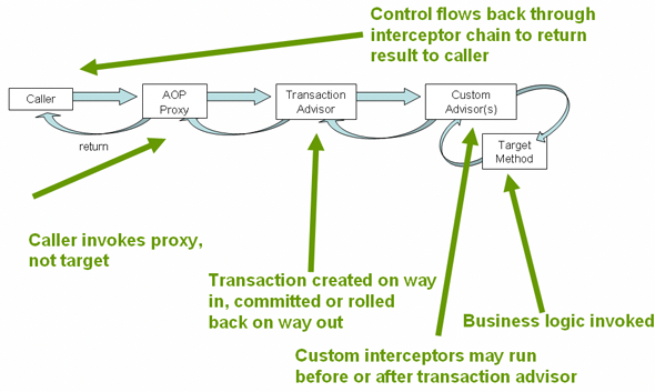 - AOP proxy에서 Transaction Advisor가 commit 또는 rollback 등의 트랜잭션 처리를 한다.