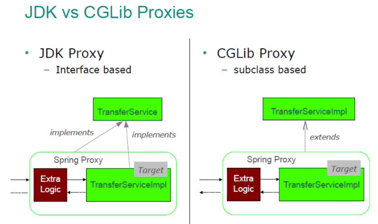 두 방식의 가장 큰 차이점은 Target의 어떤 부분을 상속 받아서 프록시를 구현하느냐에 있다.