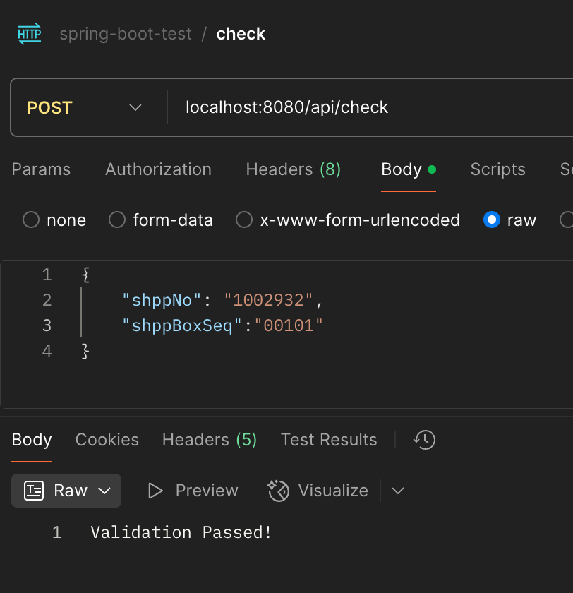public ResponseEntity<String> checkFields(@RequestBody @Validated(ValidationGroups.CreateGroup.class) ShppDircBoxDto shppDircBox) {