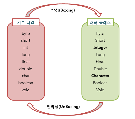 기본 타입의 값을 포장 객체로 만드는 과정을 박싱이라고 하고 반대로 포장객체에서 기본타입의 값을 얻어내는 과정을 언박싱이라고 한다.