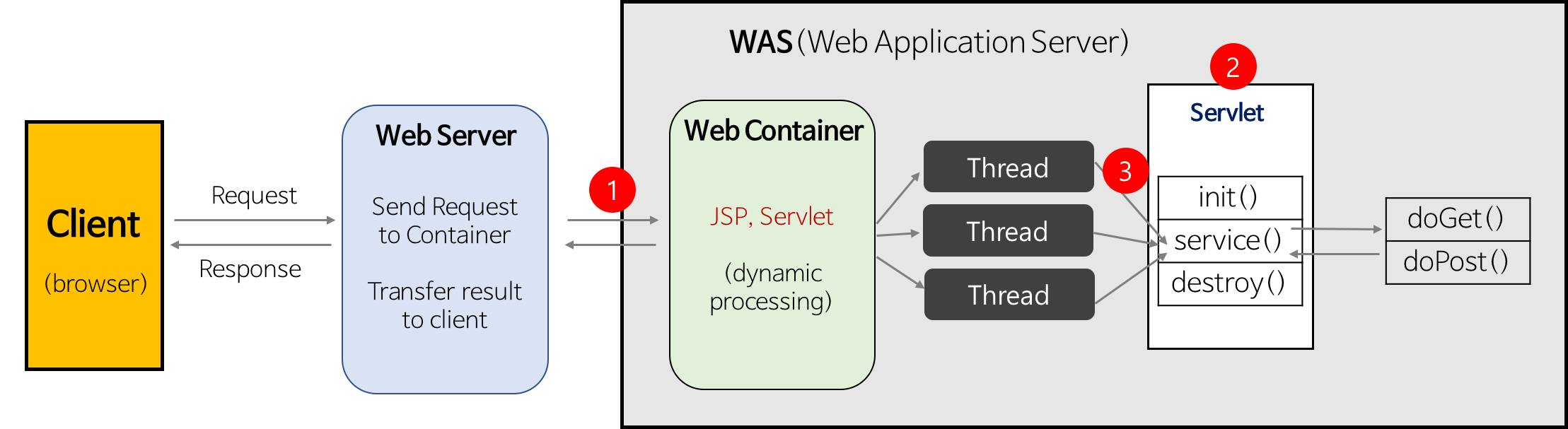 - Web Container(Servlet Container)는 thread의 생성과 제거를 담당한다.
