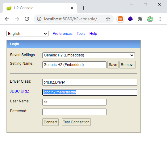 추가한 뒤 Applicationi 클래스의 main 메소드를 실행합니다. 8080포트로 톰켓이 실행됐다면, 웹 브라우저에서 http://localhost:8080/h2-console로 접속하면 다음과 같은 웹 콘솔 화면이 등장합니다.