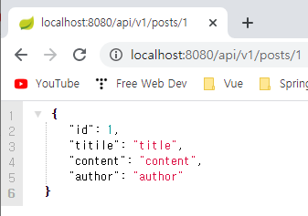 아래와 같이 API를 요청해 보겠습니다. 브라우저에 http://localhost:8080/api/v1/posts/1을 입력해 API 조회기능을 테스트해 봅니다.