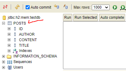 H2 관리자 페이지 이동 후에는 다음과 같이 POSTS 테이블이 정상적으로 노출되어야 합니다.
