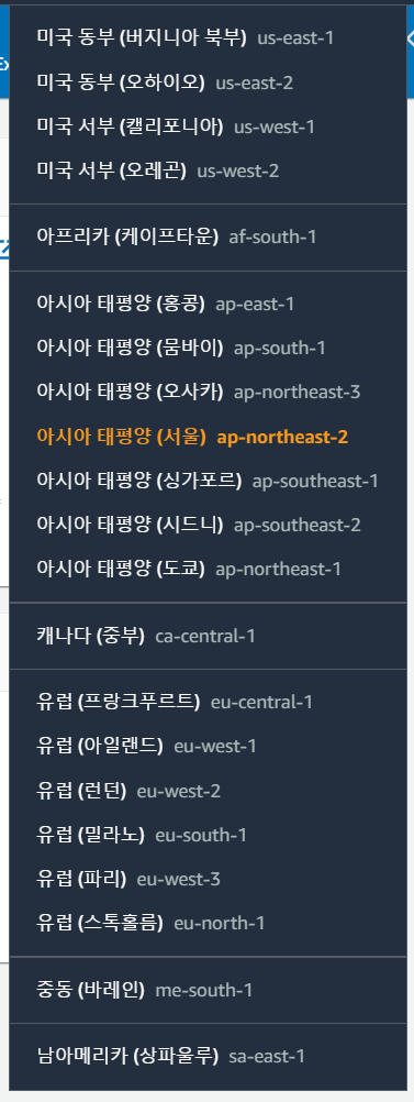 AWS Console에서 아시아 태평양(서울 : ap-northeast-2)으로 지정을 해야하는데 default인 미국 동부(버즈니아 북부 : us-east-1)로 지정을 하고 EC2 인스턴스를 생성했었습니다. 그래서 처음부터 다시 세팅을 진행했습니다.