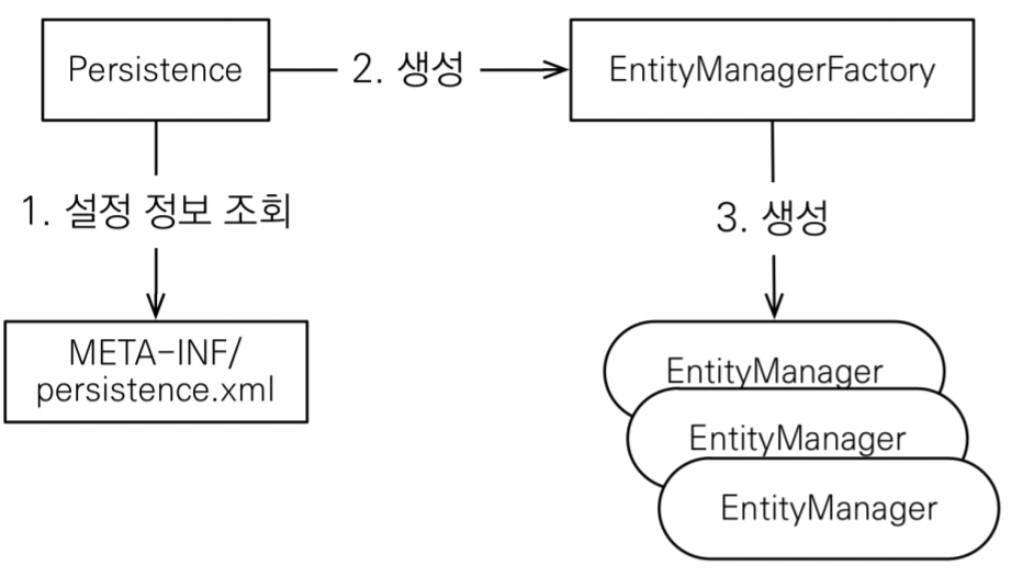 ※ Persistenct 클래스에서 설정 정보(1)를 읽어서 EntityManagerFactory 생성(2) 후 EntityManager 들을 생성(3)합니다.