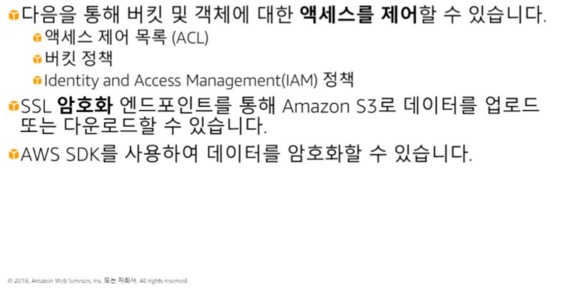 - 객체 크기 최대 5 TB, 버킷 크기에는 제한이 없습니다.