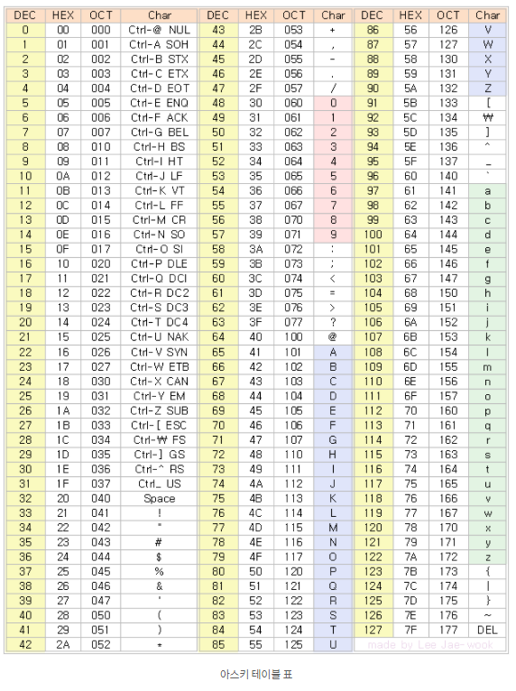 - ASCⅡ( American Standard Code for Information Interchange ) : 미국 정보교환 표준코드