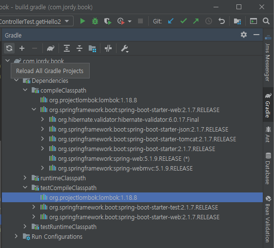 build.gradle 의존성 추가 후 Reload All Gradle Projects(Gradle Sync)