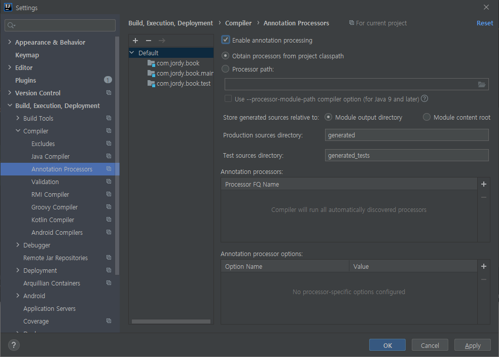 룸복은 프로젝트마다 설정해야 합니다. 플러그인 설치는 한 번만 하면 되지만, build.gradle에 라이브러리를 추가하는 것과 Enable Annotation Processing를 체크하는 것은 프로젝트마다 진행해야 합니다.