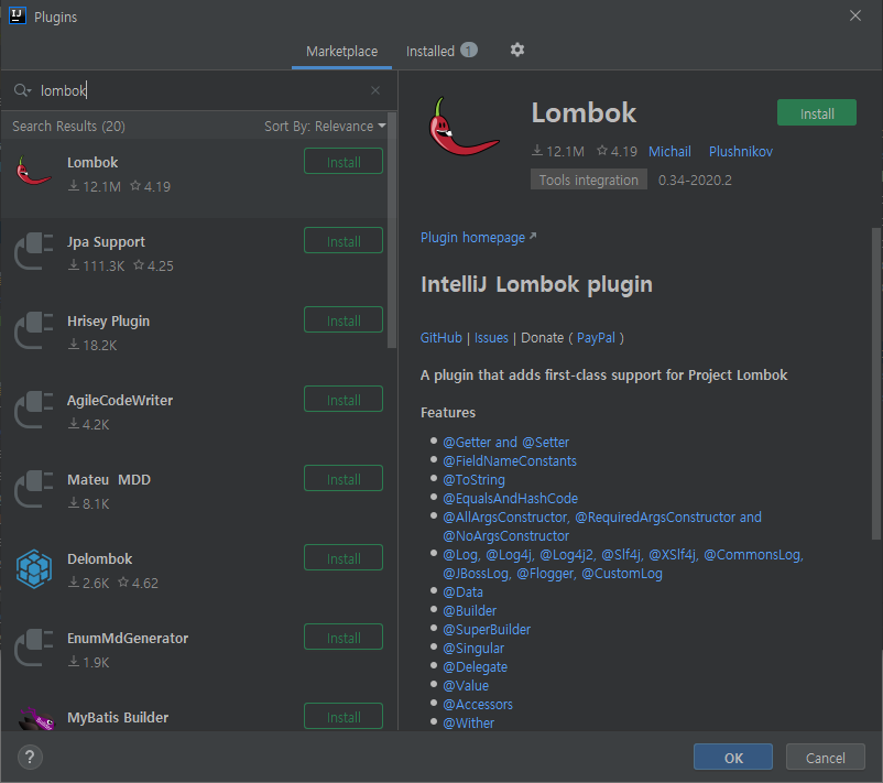 ※ IntelliJ 2020.2 버전과 Lombok은 호환이 안된다고합니다. 다른버전으로 진행해야한다고 하네요;