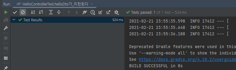 - HelloController(Test 포함)에서 ResponseDto를 사용하도록 코드 추가