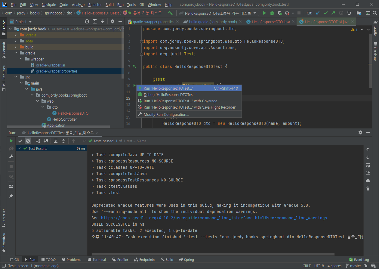 HelloResponseDtoTest.java에서 메소드 실행 시 아래와 같은 에러가 발생합니다. Testing started at 오후 11:08 ... Task :cleanTest UP-TO-DATE Task :compileJava FAILED C:\Users\ssooy\Desktop\dev\springboot-book\src\main\java\c...