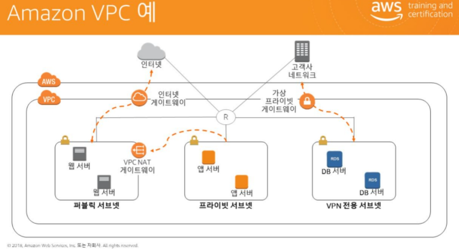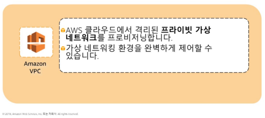 Amazon Virtual Private Cloud(Amazon VPC)를 이용하여 사용자의 데이터센터에서 운영하는기존 네트워크와 매우 유사한 가상 네트워크 토폴로지를 정의 할 수 있습니다. 가상네트워킹 환경을 완벽하게 제어 할 수 있으며, IP 주소범위선택, 서브넷생성, 라우팅 테이블구성, 네트워크게이트웨이등Amazon VPC의 네트워크 구성을 쉽게 사용자 정의 할 수 있습니다