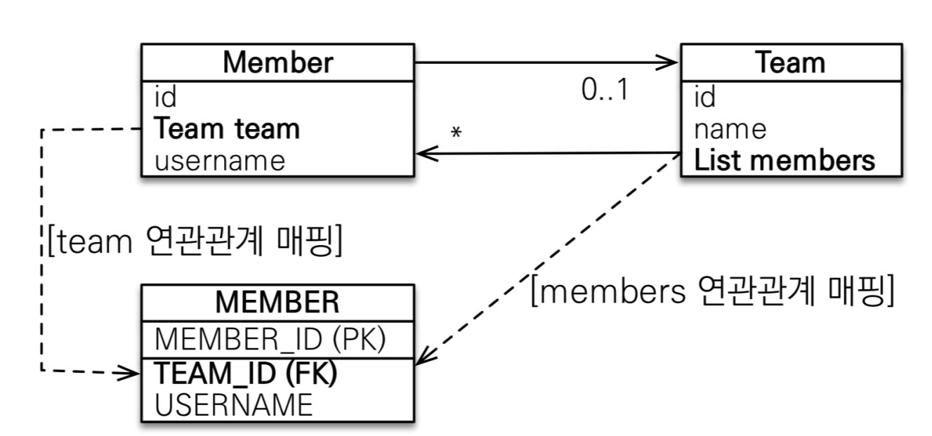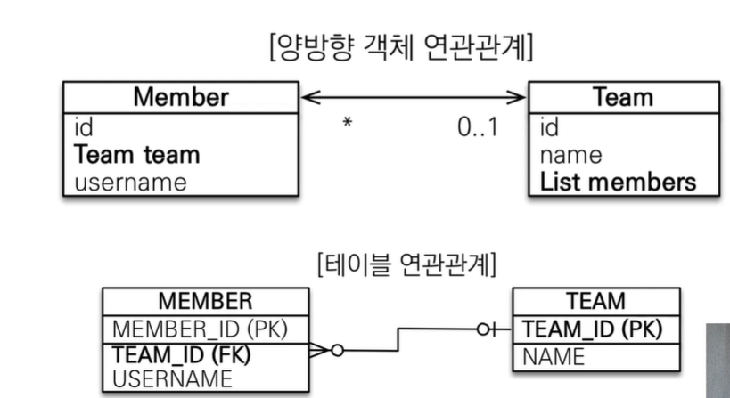 - 객체의 양방향 관계는 사실 양방향 관계가 아니라 서로 다른 단방향 관계 2개이다.