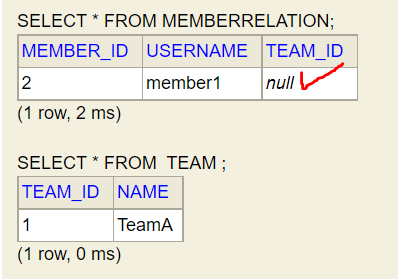 -> 해결방법 : 둘(Member, Team) 중 하나로 외래키를 관리해야 한다.