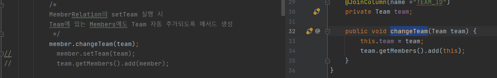 - ex. chacneTeam에 코드 추가, setTeam메서드를 사용해도 되지만 보통 단순 값 작업(get, set)을 할때만 주로 사용합니다. 그래서 추가 로직이 들어가는 경우 별도로 메서드를 생성해서 진행하