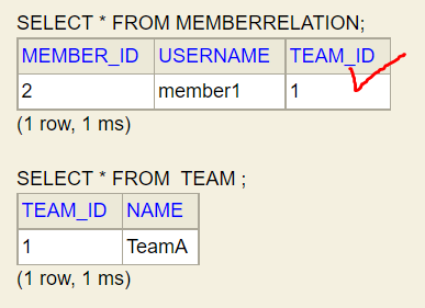 - 팀 -> 회원 연관관계 1개( 단방향 )