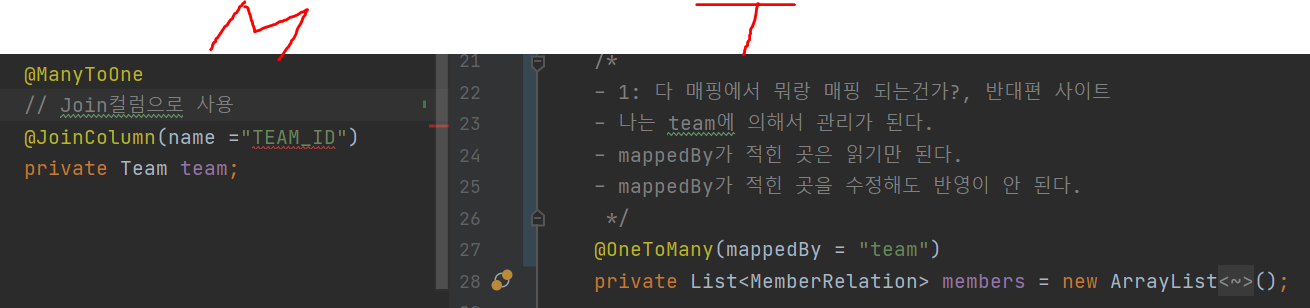 @OneToMany(mappedBy = "team")// 1: 다 매핑에서 뭐랑 매핑 되는건가?, 반대편 사이트